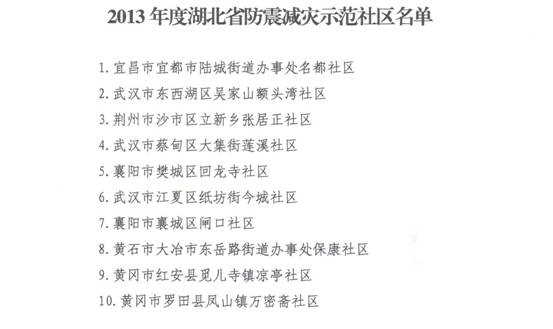 2013年初认定:兴山县古夫镇龙珠社区、鄂州市燕矶镇池湖社区、麻城市经济开发区黄金桥社区